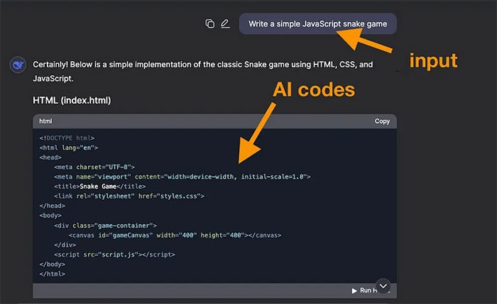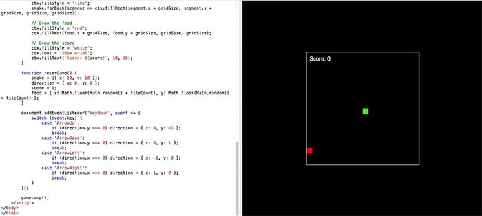 Người dùng có thể tận dụng DeepSeek để viết mã nguồn tương tự như cách ChatGPT hoạt động. Ví dụ, yêu cầu AI viết một trò chơi rắn, và kết quả sẽ như sau: