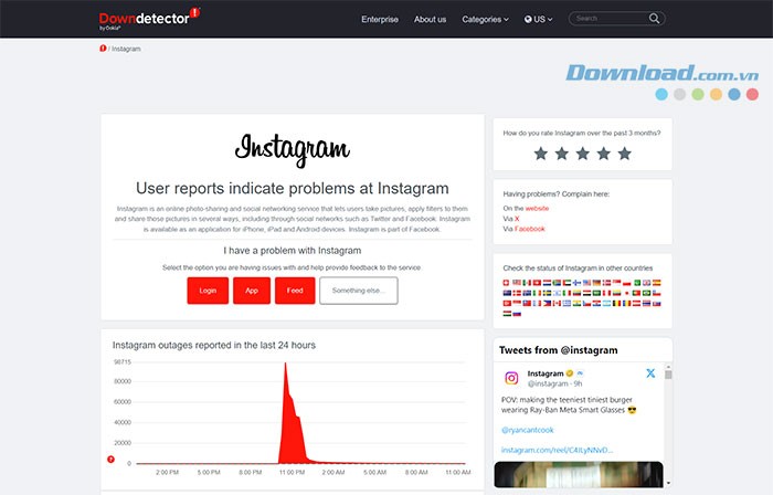 Việc đăng nhập tài khoản Instagram đôi khi gặp khó khăn do sự cố từ phía máy chủ của nền tảng này. Để nắm bắt tình hình, người dùng có thể tham khảo các trang web chuyên theo dõi trạng thái hoạt động của dịch vụ trực tuyến, ví dụ như Downdetector.