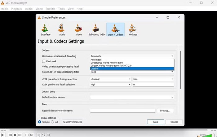 Tăng tốc phần cứng đôi khi có thể gây ra xung đột với card đồ họa, dẫn đến lỗi phát video. Hãy thử tắt tính năng này trong VLC bằng cách vào Tools > Preferences > Input / Codecs, sau đó chọn "Disable" ở mục "Hardware-accelerated decoding".