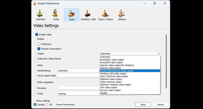 Đôi khi, việc thay đổi output video có thể giải quyết vấn đề. Truy cập Tools > Preferences > Video và chọn "DirectX (DirectDraw) video output" từ menu thả xuống. Sau đó, khởi động lại VLC để áp dụng thay đổi.