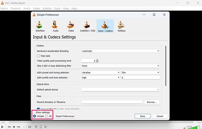 - Mở cửa sổ Preferences, sau đó chọn tab Input/Codecs. Tiếp theo, nhấn vào nút All trong phần Show settings và chọn Input/Codecs.