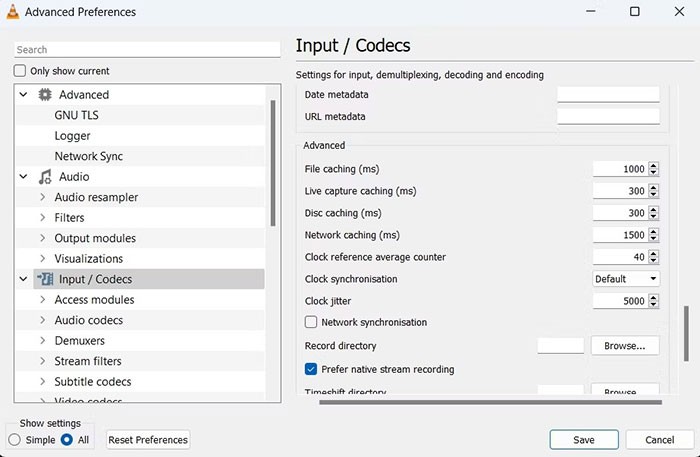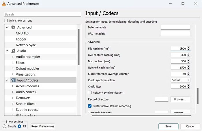 Việc điều chỉnh bộ nhớ cache có thể cải thiện hiệu suất phát video. Vào Tools > Preferences > Input / Codecs và tăng giá trị của "File caching (ms)" và "Network caching (ms)" lên một chút. Hãy thử nghiệm với các giá trị khác nhau để tìm ra cài đặt phù hợp nhất.