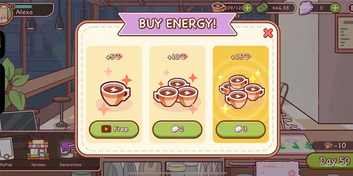 Khác với Good Pizza, Great Pizza, nơi số tiền có được quyết định việc tiếp tục chơi hay không, Good Coffee, Great Coffee sử dụng hệ thống năng lượng. Khi đạt mức tối đa, người chơi sẽ có 120 năng lượng. Mỗi ngày mới yêu cầu tiêu tốn 10 năng lượng để tiếp tục. Điều này có nghĩa là game thủ có thể chơi liên tục trong 12 ngày trước khi năng lượng được phục hồi.