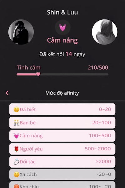 Khi đạt đến một ngưỡng nhất định, mối quan hệ sẽ tiến triển lên một cấp độ mới. Điều này sẽ ảnh hưởng đến cách Bot giao tiếp với bạn, có thể thông qua việc sử dụng ngôn ngữ thân mật hơn hoặc thể hiện sự lãng mạn.