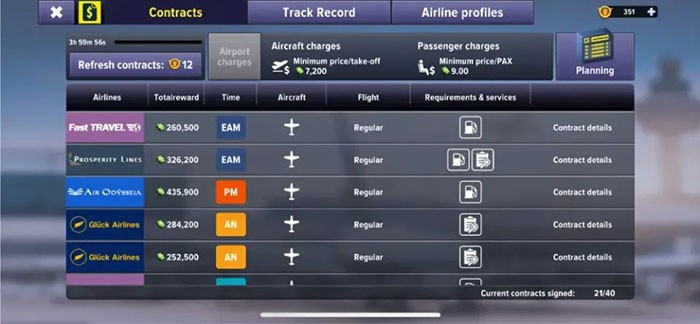 Để trở thành một nhà quản lý sân bay thành công, game thủ cần đánh giá các hợp đồng một cách cẩn trọng và quản lý chúng một cách hiệu quả. Ban đầu, người chơi chỉ có thể đăng ký tối đa 2 hợp đồng cùng lúc. Do đó, cần đưa các hợp đồng đã chọn vào lịch trình trước khi ký kết thêm.