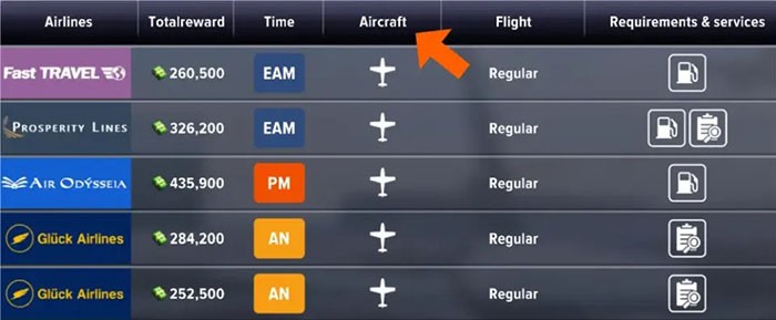 Việc lựa chọn các danh mục lọc sẽ giúp trò chơi tự động sắp xếp các hợp đồng theo tiêu chí đã chọn. Tính năng này cho phép nhóm các chuyến bay theo cùng một Airline (Hãng hàng không), Time (Thời gian), Aircraft (Máy bay), Flight Type (Loại chuyến bay), cũng như Requirement (Yêu cầu) và Service (Dịch vụ). Nhấp vào Total Reward sẽ giúp sắp xếp các hợp đồng theo thứ tự lợi nhuận, từ thấp đến cao hoặc ngược lại.
