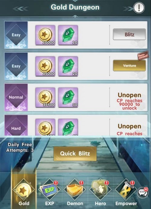 Các loại ngục tối bao gồm Gold Dungeon, EXP Dungeon, Demon Dungeon, Hero Dungeon và Empower Dungeon. Mức độ khó của mỗi ngục tối, cũng như giá trị phần thưởng nhận được, sẽ tăng dần theo chỉ số CP (Combat Power) của nhân vật.
