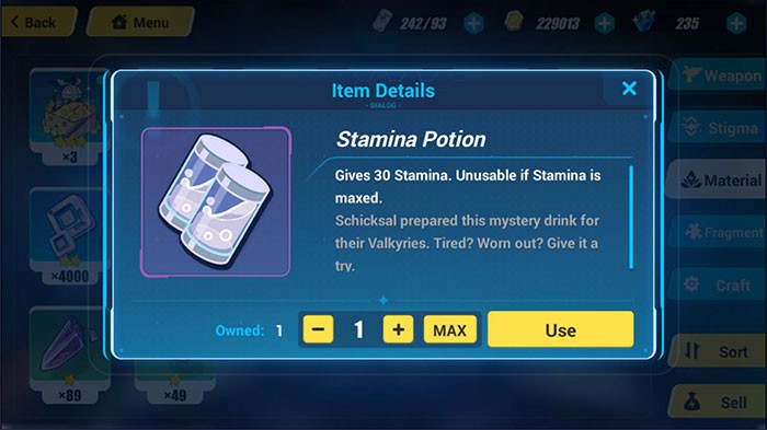 Trong quá trình chơi, bạn sẽ thường xuyên nhận được Stamina Potion như một phần thưởng. Những bình thuốc này có thể được lưu trữ trong kho của bạn mà không có giới hạn về thời gian và chỉ nên sử dụng khi thực sự cần thiết.