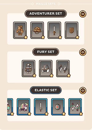 Danh sách đầy đủ các bộ trang bị có thể được xem bằng cách truy cập vào Thợ rèn. Tại đây, bạn sẽ biết được số lượng vật phẩm hiện có và những món đồ còn thiếu để hoàn thành mỗi bộ.