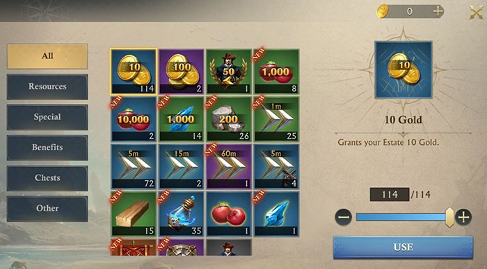 Bên cạnh đó, một số gói quà trong kho đồ còn bao gồm vàng, đơn vị tiền tệ cao cấp nhất, mở ra nhiều khả năng mua sắm các trang bị cần thiết. Các vật phẩm tăng tốc cũng thường xuất hiện, giúp người chơi phát triển nhanh chóng hơn, đặc biệt là trong giai đoạn khởi đầu.