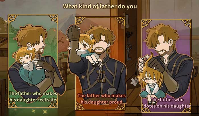 Để gia tăng giá trị Gentle, người chơi nên thể hiện sự tôn trọng đối với quyền riêng tư của con gái. Trong khi đó, nếu mục tiêu là nâng cao giá trị Brave, hãy lựa chọn bình luận về việc mỗi chiến binh đều sở hữu một rương kho báu độc nhất vô nhị. Đối với việc cải thiện giá trị Intelligence, game thủ nên ưu tiên các lựa chọn mà người cha thể hiện trí nhớ tốt và ghi nhớ những điều thú vị.
