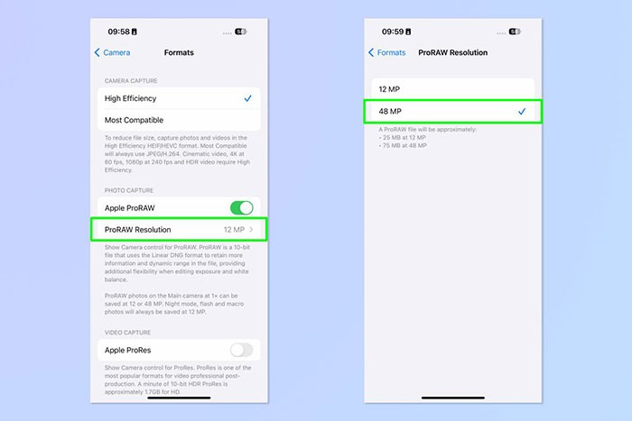 Tiếp theo, hãy truy cập vào mục Độ phân giải ProRAW và lựa chọn tùy chọn 48MP để bắt đầu chụp ảnh với độ phân giải cao nhất.