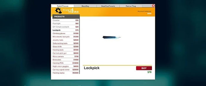 Không có gì đáng tiếc hơn việc lên kế hoạch tỉ mỉ cho một vụ trộm, chỉ để nhận ra mình đã quên mang theo các dụng cụ cần thiết. Game thủ có thể mua móc khóa, dụng cụ leo núi và các bộ công cụ hỗ trợ khác tại cửa hàng Tools4Thieves trên máy tính trong nhà.