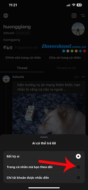 Bước 3: Một menu sẽ xuất hiện với 3 lựa chọn: Bất kỳ ai, Trang cá nhân mà bạn theo dõi hoặc Chỉ tài khoản được nhắc đến. Hãy chọn một trong các tùy chọn này để điều chỉnh đối tượng được phép trả lời Threads của bạn.