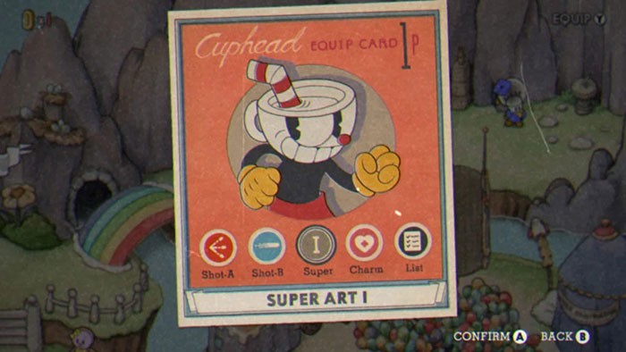 Trong thế giới của Cuphead, người chơi có thể trang bị đồng thời hai loại vũ khí khác nhau. Một là Charm, mang đến những hiệu ứng hỗ trợ độc đáo, và hai là Super Art, một kỹ năng đặc biệt với sức mạnh hủy diệt.