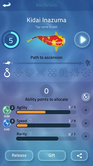 Để cải thiện tốc độ di chuyển và khả năng chuyển hướng linh hoạt của cá, người chơi nên tập trung phân bổ điểm vào các thuộc tính quan trọng như tốc độ và độ nhanh nhẹn. Điểm kỹ năng được trao tặng mỗi khi cá Koi đạt cấp độ mới, và tiến trình này được hiển thị trực quan qua thanh tăng cấp ở góc trên bên trái giao diện.