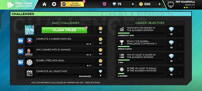 Tại đây, một loạt các mục tiêu sẽ được đề xuất, yêu cầu game thủ chinh phục mỗi ngày. Ví dụ, một thử thách có thể là duy trì một hàng phòng ngự không để lọt lưới, đồng thời sử dụng thủ môn dự bị trong trận đấu.