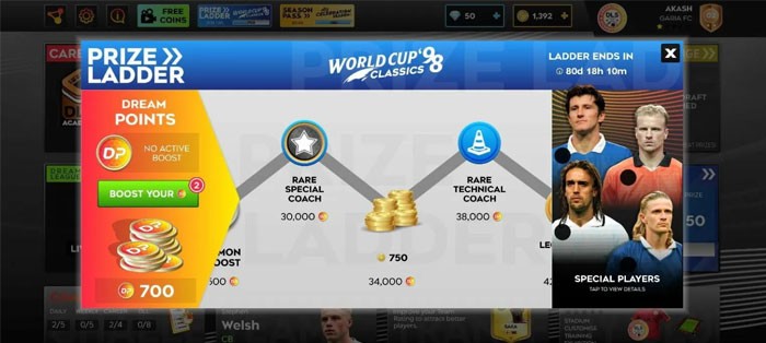 Việc tích lũy Dream League Point liên tục sẽ giúp người chơi thăng tiến trên Prize Ladder, từ đó mở khóa các vật phẩm giá trị như đá quý, tiền xu, và đặc biệt là 4 cầu thủ huyền thoại từng tỏa sáng tại World Cup 98. Mỗi giai đoạn của Prize Ladder kéo dài 90 ngày, và những cầu thủ kinh điển mới sẽ được cập nhật vào cuối mỗi giai đoạn.