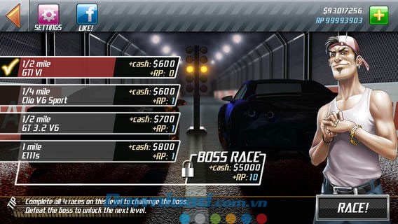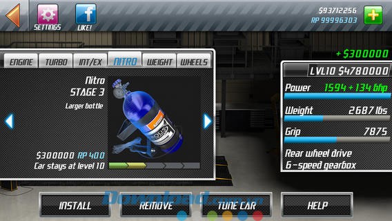 - Nâng cấp xe bằng cách tăng giá trị và cấp độ của xe đua.