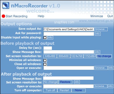 Nếu bạn thường xuyên sử dụng máy tính để thực hiện các tác vụ như kiểm tra email, quét virus, cập nhật tin tức, giải trí bằng âm nhạc hoặc trò chơi điện tử, hẳn bạn đã từng ước ao có thể ra lệnh cho máy tính tự động hoàn thành chúng, để bạn có thể tập trung vào việc theo dõi kết quả. Chương trình Nmacro Recorder đáp ứng mong muốn đó bằng cách ghi lại toàn bộ các thao tác của bạn trên máy tính – bao gồm cả thao tác chuột và bàn phím – sau đó lưu trữ chúng thành một file thực thi (*.exe) có khả năng tự động chạy và thực hiện theo lệnh.