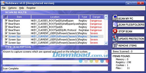 Sau khi quá trình quét hoàn tất, bạn sẽ có quyền quyết định liệu có muốn xóa các spyware được tìm thấy hay không. Trong trường hợp bạn vô tình xóa nhầm, chương trình cũng cung cấp tùy chọn phục hồi.