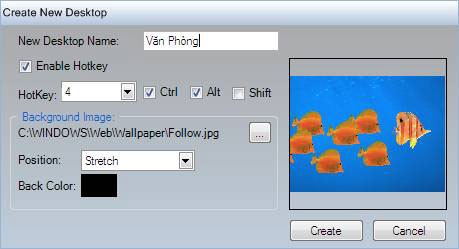Sau thao tác này, hộp thoại Create New Desktop sẽ xuất hiện, cung cấp các tùy chọn để bạn cấu hình môi trường làm việc theo ý muốn.