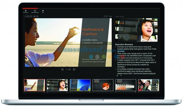 - Presenter View mới trong PowerPoint hiển thị slide hiện tại, slide tiếp theo, ghi chú của người trình bày và bộ đếm thời gian trên máy Mac của bạn, trong khi vẫn hiển thị slide đầy đủ cho khán giả.