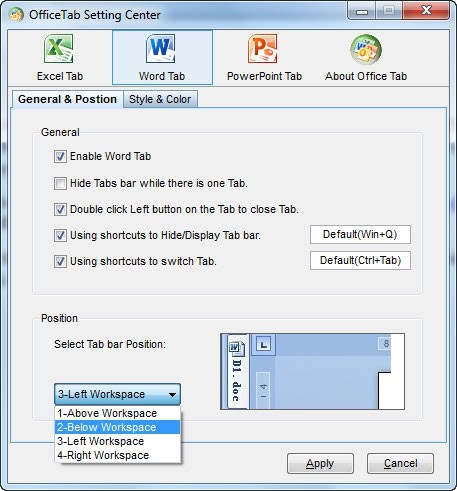 Sau khi hoàn tất quá trình cài đặt, hãy khởi động Office Tab Center desktop bằng cách nhấp đúp vào biểu tượng trên màn hình. Một cửa sổ thiết lập sẽ mở ra, cho phép bạn tùy chỉnh cách hiển thị các thẻ.