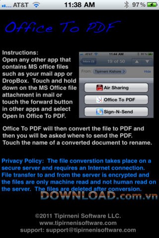 - Xuất PDF đầy đủ theo nhiều cách khác nhau như qua Email, DropBox, gửi tới các ứng dụng khác như Sign-N-Send.