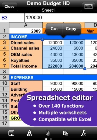 Office2 tận dụng tối đa ưu điểm của màn hình cảm ứng iPhone, cho phép người dùng thực hiện các thao tác chọn và kéo để điều chỉnh chiều cao của dòng và chiều rộng của cột. Việc soạn thảo công thức tính cũng trở nên dễ dàng hơn nhờ khả năng gõ trực tiếp vào các ô.