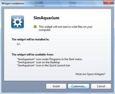 Khi quá trình tải xuống hoàn tất, hộp thoại cài đặt widget sẽ hiện ra. Nhấn nút Install để bắt đầu cài đặt widget vào thư mục mặc định. Việc thay đổi thư mục cài đặt bằng tùy chọn Customize > Choose có thể gây ra lỗi hoạt động của widget, vì vậy không nên thực hiện.
