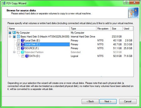 Tại hộp thoại Browse for source disks, hãy chọn các phân vùng mà bạn muốn đưa vào máy ảo (ví dụ: phân vùng chứa hệ điều hành Windows), rồi nhấn Next để tiếp tục.