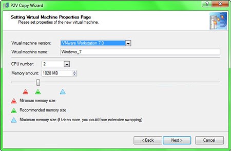 Dựa trên phần mềm máy ảo đã được chọn, bạn cần xác định phiên bản của phần mềm đó tại mục Virtual machine version (ví dụ: VMware Workstation 7.0). Tiếp đó, hãy đặt tên cho máy ảo tại mục Virtual machine name, chọn số lượng nhân CPU dành cho máy ảo tại mục CPU number và dung lượng bộ nhớ RAM của máy ảo tại mục Memory amount. Nhấn Next khi đã hoàn tất.