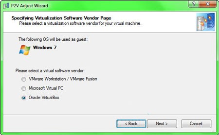 Nếu bạn đã có sẵn file đĩa ảo dùng cho VMware nhưng muốn sử dụng nó trên máy ảo của VirtualBox, tính năng P2V Adjust OS sẽ giúp bạn thực hiện việc này. Ngoài ra, P2V Adjust OS cũng có thể chuyển đổi file đĩa ảo định dạng .vhd trong Windows Vista/7 sang các định dạng khác.