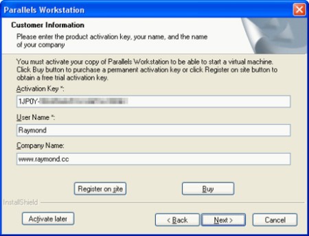 6. Nhập key kích hoạt Parallels Workstation đã nhận được. Không cần nhập tên người dùng.