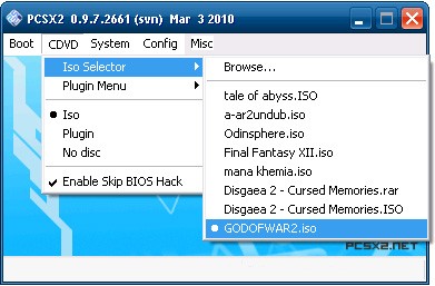 Do chúng ta sử dụng file ảnh ISO để chơi game, nên có thể bỏ qua bước cấu hình CDVD. Sau khi tải game PS2 về và giải nén, bạn sẽ thu được một file (thường có đuôi .iso). Khởi động chương trình PCSX2, sau đó chọn CDVD -> ISO Selector -> Browse, chỉ định đường dẫn đến file ISO đã tải về và chọn Run CDVD.