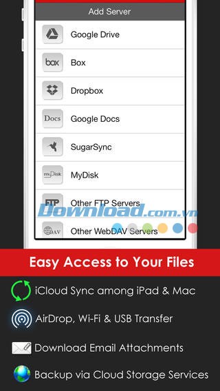 Ứng dụng tích hợp các dịch vụ lưu trữ đám mây phổ biến như SugarSync, Box.net, Dropbox và iDisk, giúp đơn giản hóa việc lưu trữ dữ liệu.
