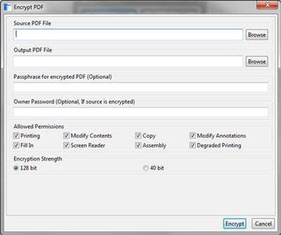 Việc đặt mật khẩu cho file đã mã hóa được thực hiện ở mục Passphrase for encrypted PDF. Nếu file gốc đã được bảo vệ bằng mật khẩu, hãy nhập mật khẩu đó vào mục Owner Password. Các quyền hạn truy cập sau khi mã hóa có thể được cấu hình ở mục Allowed Permissions. Nên ưu tiên sử dụng chế độ mã hóa 128bit để đảm bảo an toàn tối đa.