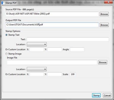 Chọn Stamp Text để đóng dấu dạng văn bản, tùy chỉnh vị trí đóng dấu bằng tọa độ được hỗ trợ. Hoặc sử dụng Stamp Image để đóng dấu bằng hình ảnh (watermark).