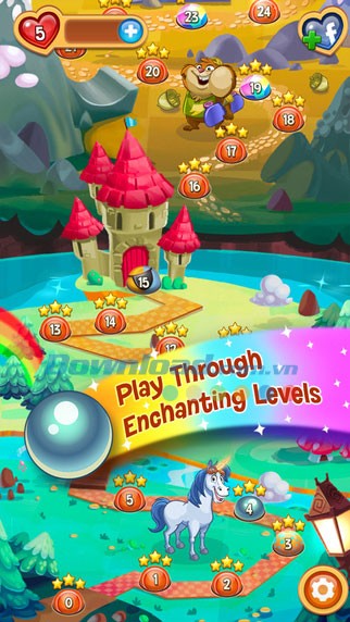 Khám phá bản đồ game cùng chú ngựa trắng đáng yêu, một thế giới bao la với vô số bí mật đang chờ bạn khám phá – từ con tàu của những tên cướp biển cho đến nhà hát Opera trong hang động của Madame Batrina... Đạt được thứ hạng cao và nhận những phần thưởng giá trị bằng cách vượt qua tất cả các cấp độ trong Peggle Blast. Âm nhạc sống động được lồng ghép vào game, biến mỗi pha bắn bi trở thành một trải nghiệm khó quên!