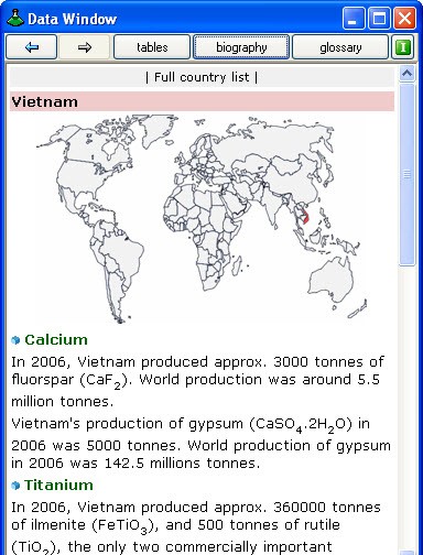 Ví dụ, với Việt Nam, bạn sẽ thấy thông tin về các kim loại như Canxi, titan, vàng, đồng, crom,... và hiểu rõ hơn về nguồn tài nguyên mà đất nước mình đang sở hữu. Tuy nhiên, cần lưu ý rằng toàn bộ thông tin trong phần mềm được trình bày bằng tiếng Anh, điều này có thể gây khó khăn cho một số người dùng.