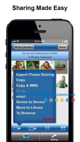 - Chia sẻ ảnh nhanh chóng giữa các thiết bị iOS thông qua kết nối không dây WiFi và Bluetooth, yêu cầu cả hai thiết bị đều cài đặt Photo Safe Pro for iOS.