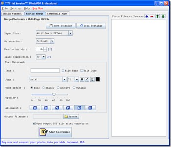 PhotoPDF cho phép người dùng tùy chỉnh nhiều thông số đầu ra để đạt được kết quả mong muốn. Kích thước trang giấy có thể được điều chỉnh, bao gồm các khổ phổ biến như A3, A4, A5, hoặc tùy chỉnh theo kích thước hình ảnh gốc.