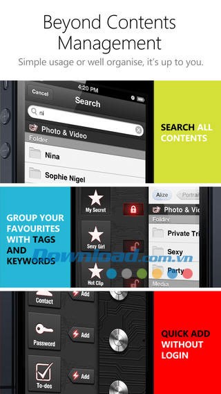 Ngoài ra, Pic Lock 3 Ultimate Free for iOS còn hỗ trợ lưu trữ và quản lý an toàn các mật khẩu đăng nhập và truy cập, cùng với các theme và biểu tượng tùy chỉnh. Tính năng bảo vệ và lưu trữ danh sách số liên lạc quan trọng còn cho phép thực hiện kết nối cuộc gọi nhanh chóng chỉ với một chạm.