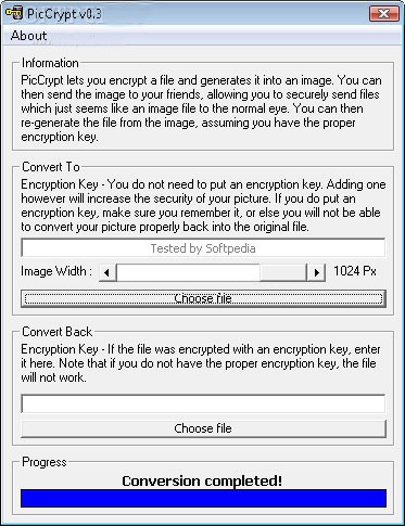 PicCrypt là một tiện ích miễn phí, cho phép người dùng nén và ẩn bất kỳ loại tệp tin nào vào bên trong một tệp ảnh 24 bit. Quá trình này sử dụng thư viện nén zLib (zLib File Compression Library) để đảm bảo hiệu quả.