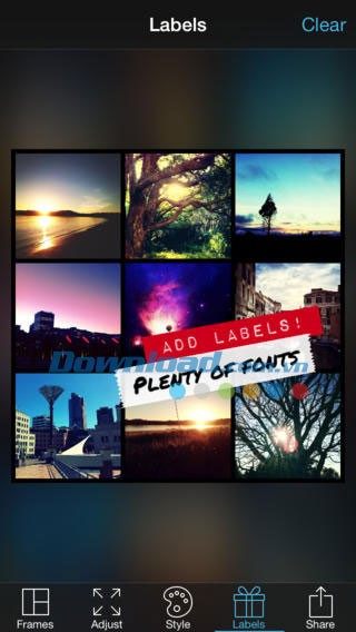 Khả năng thêm các nhãn chữ vào khung ảnh với đa dạng kiểu phông chữ, cùng các nhãn dán hình vuông, tròn hoặc cong, giúp tùy chỉnh màu sắc chữ và nhãn một cách dễ dàng.