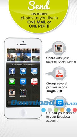 Ứng dụng cho phép gửi số lượng ảnh không giới hạn qua email dưới dạng tệp đính kèm, tất cả trong cùng một email duy nhất.