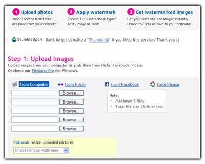 Dịch vụ này hỗ trợ tải ảnh từ nhiều nguồn khác nhau, bao gồm máy tính cá nhân, Flickr, Picasa, hoặc Facebook. Bạn có thể xử lý đồng thời tối đa 5 file ảnh, với tổng dung lượng không vượt quá 25MB. Đây là một phương pháp hiệu quả để bảo vệ quyền sở hữu trí tuệ đối với tác phẩm hình ảnh của bạn.
