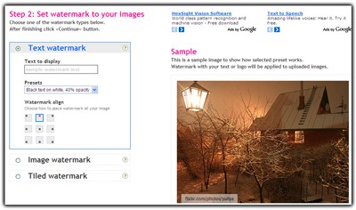 Bước 2 mặc định chọn tùy chọn Text watermark, cho phép bạn chèn chữ lên hình ảnh. Chỉ cần nhập nội dung bạn muốn hiển thị vào khung Text to Display, chọn màu sắc phù hợp từ mục Presets và điều chỉnh vị trí của văn bản trên ảnh bằng khung Watermark align.