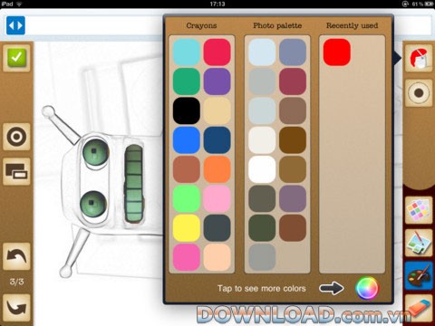 Ứng dụng hỗ trợ vẽ tranh bằng nhiều phong cách khác nhau, bao gồm màu crayon và bảng màu đa dạng.
